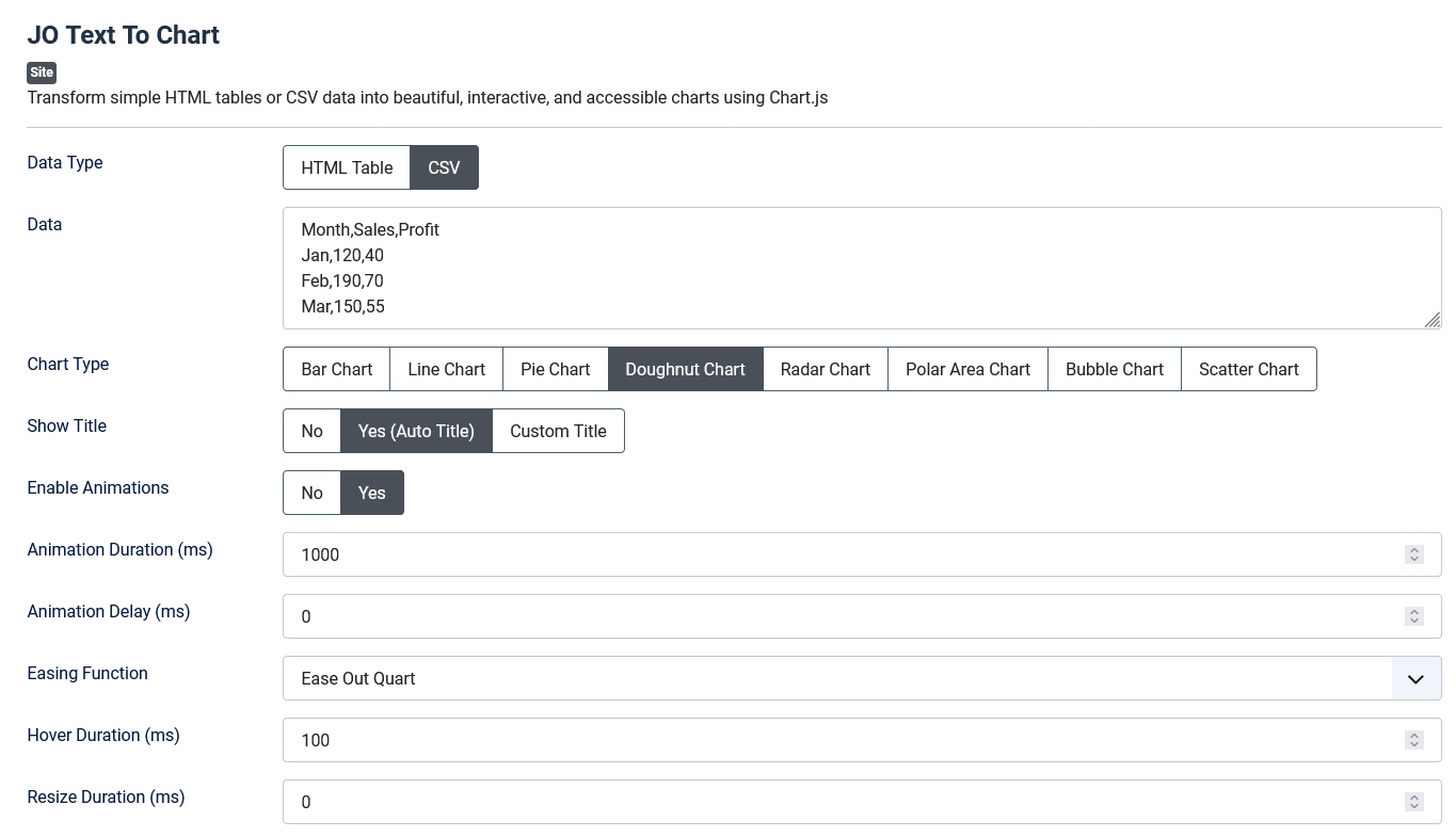 JO Table To Chart transform simple HTML tables or CSV data into beautiful, interactive, and accessible charts using Chart.js — directly in any Joomla article, module position, or custom layout.